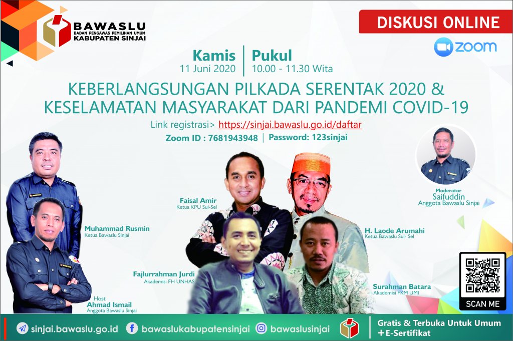 \n\n\n\nMenjawab persoalan tersebut, Bawaslu Sinjai akan malaksanakan diskusi daring (online) dengan tema "Keberlangsugan Pilkada Serentak 2020 dan Keselamatan Masyarakat ditengah Covi-19". Ada beberapa pembicara dalam diskusi itu, seperti Ketua Bawaslu Provinsi Sulsel Laode Arumahi, Ketua KPU Sulsel Faisal Amir, Akademisi FKM UMI Surahman Batara serta Akademisi FH UNHAS Fajlurrahman Jurdi yang dimoderatori Saifuddin dan Ahmad Ismail Anggota Bawaslu sinjai.